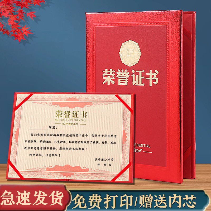 荣誉证书a4烫金外壳封面支持赠送内芯纸打印内容