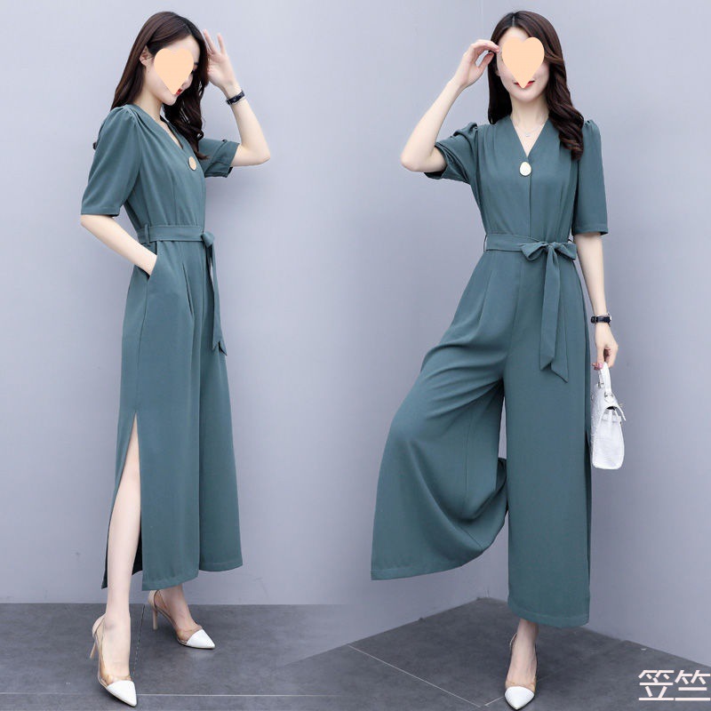 阔腿连体裤女2023夏季新款大码宽松高腰遮肚连体衣九分裤休闲套装
