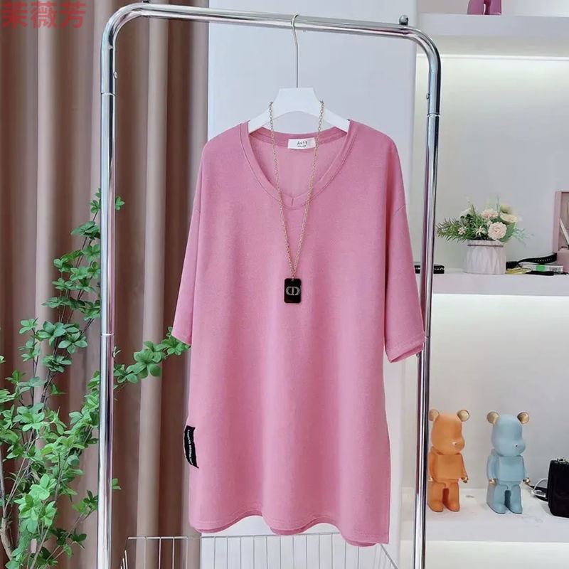 休闲减龄净版V领开叉设计T恤宽松上衣洋气短袖女设计感小众中长款