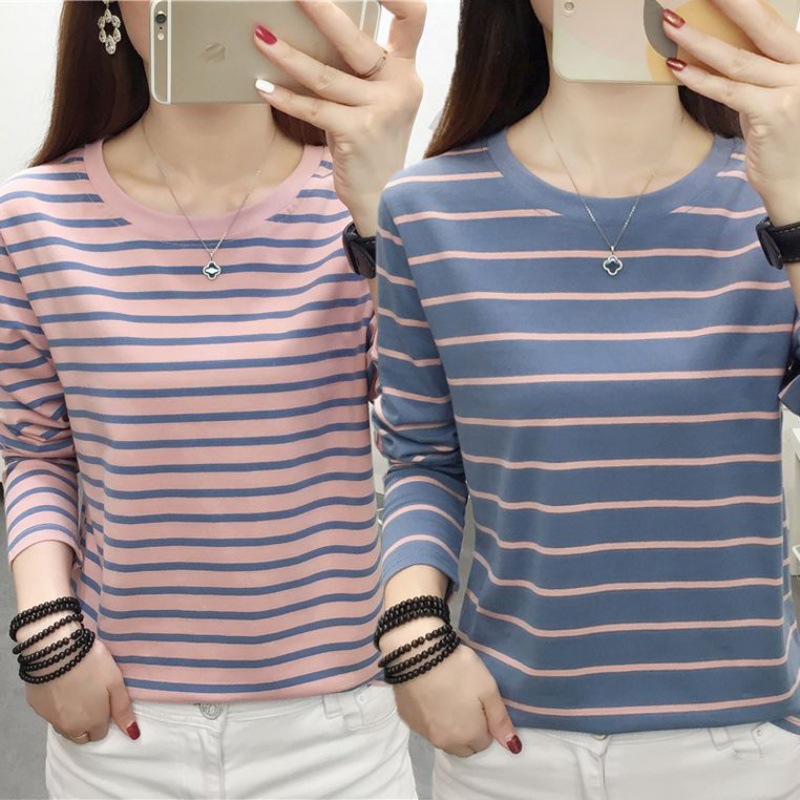 纯棉条纹长袖T恤女新款春夏衣女装妈妈大码宽松显瘦打底衫上衣服