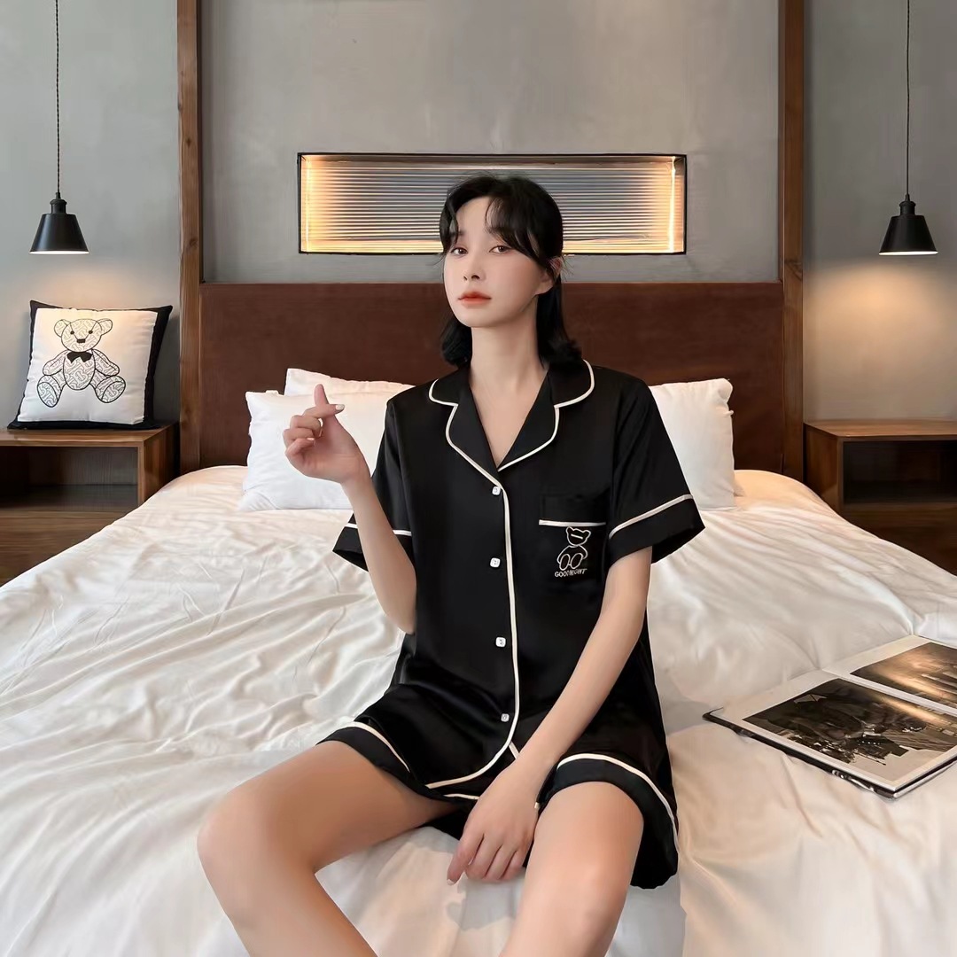 2022新款简约冰丝睡衣女夏季薄款短袖短裤纯色时尚家居服套装批发
