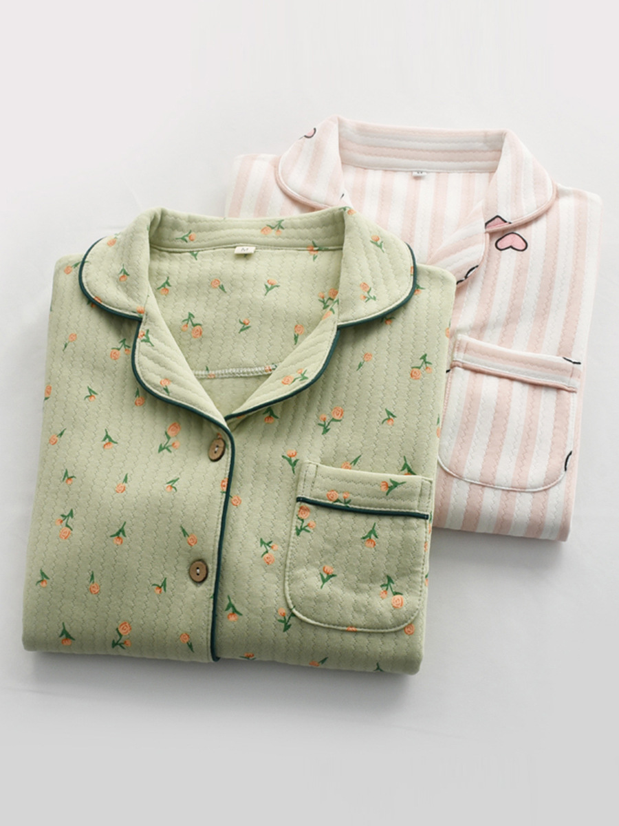 系 空气层睡衣女士秋冬季加厚夹棉长袖长裤开衫家居服套装