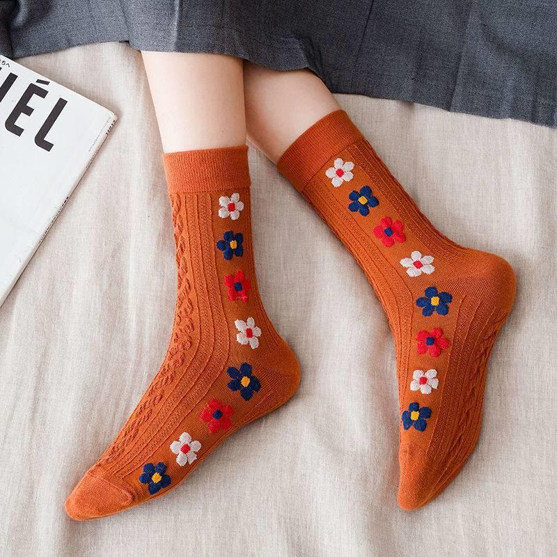 袜子女秋冬3双复古小花袜子女筒袜中ins潮装春秋日系可爱长筒袜堆