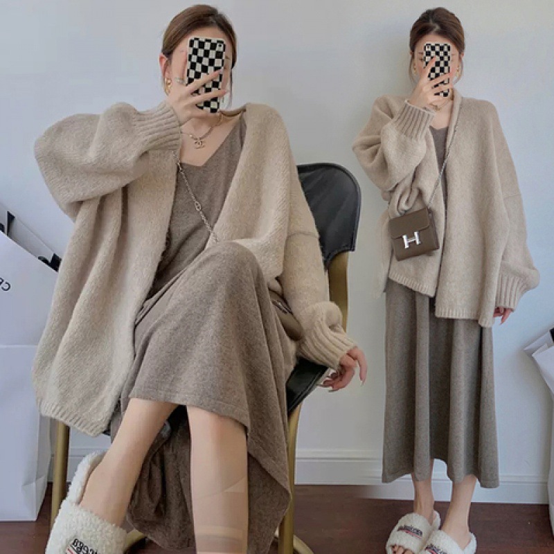 孕妇装秋款新款时尚显瘦吊带针织连衣裙+毛衣外套冬装潮妈两件套