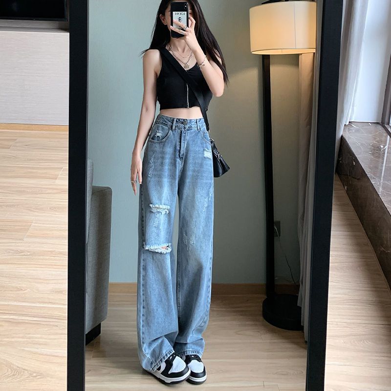 辣妹破洞牛仔裤女夏季薄款2023新款高腰显瘦直筒大码垂感阔腿长裤