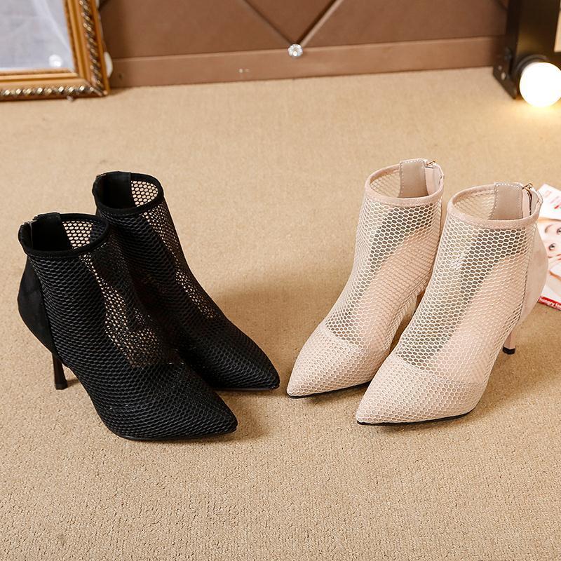 2023春夏新款尖头短靴网纱凉靴欧美性感细跟裸靴单靴子高跟女网靴