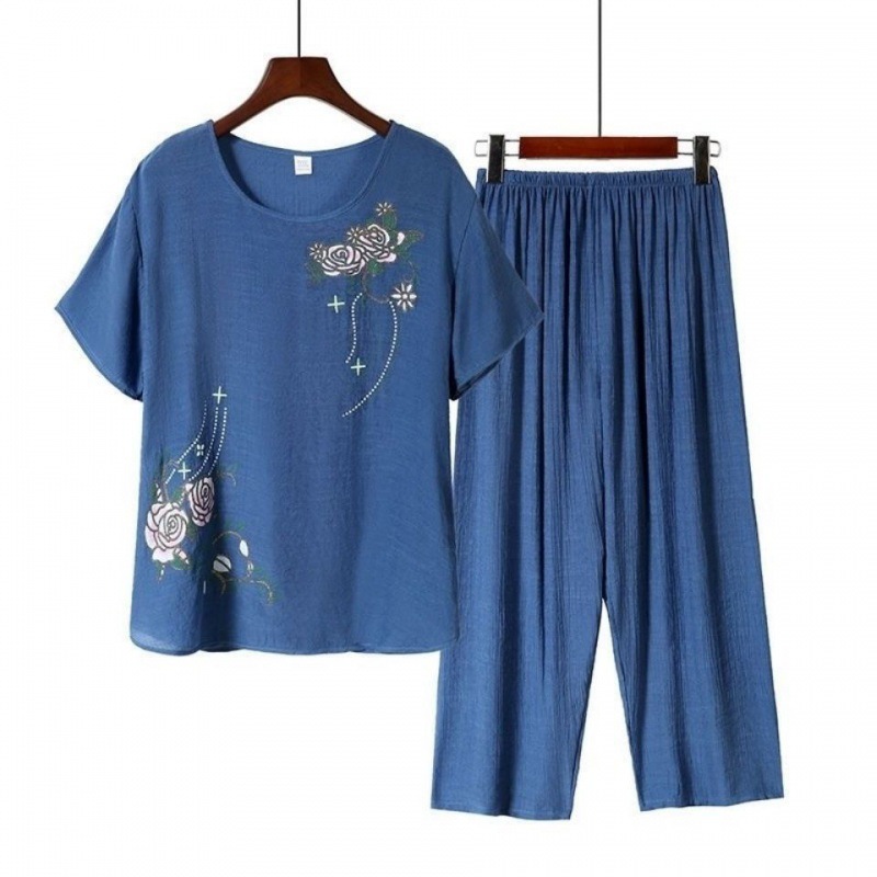 妈妈夏季女装套装中老年人棉麻短袖妈妈装宽松两件套装上衣裤子