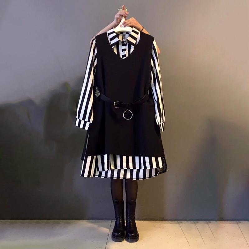 休闲套装女2022春秋季新款宽松马甲衬衫连衣裙韩版洋气两件套