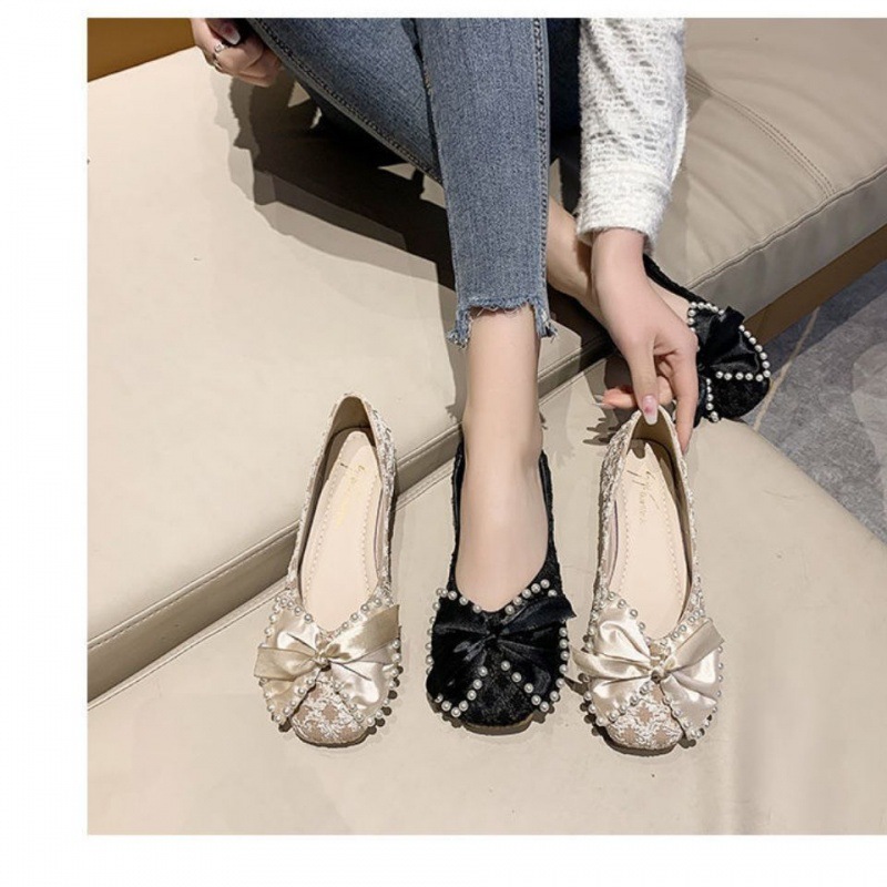 单鞋女2023年新款春秋季方头浅口法式少女珍珠蝴蝶结平底鞋四季鞋