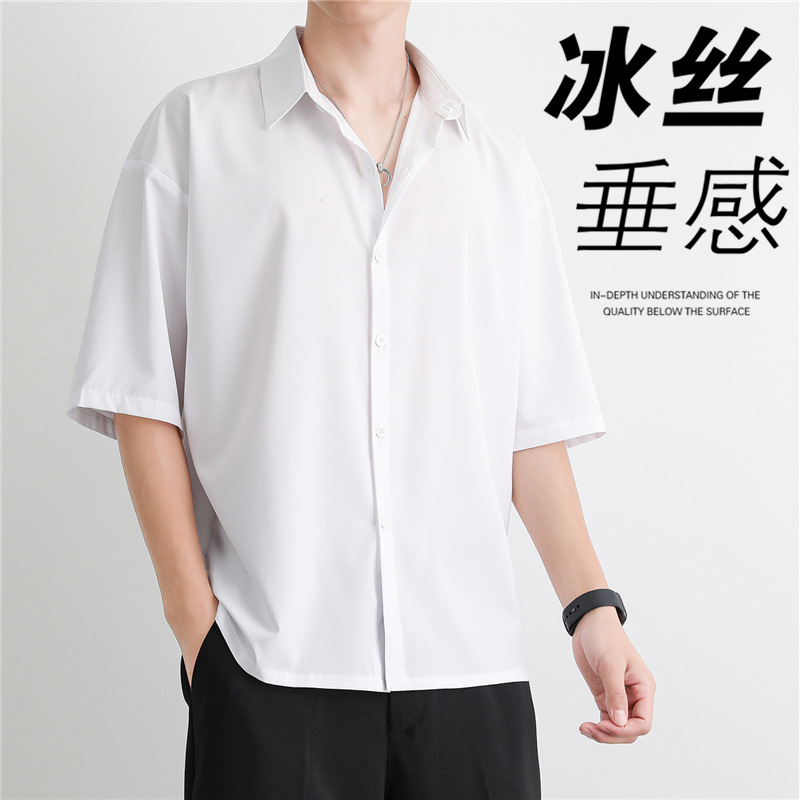 冰丝短袖衬衫男夏季韩版衬衣港风日系宽松大码五分袖寸衫免烫抗皱