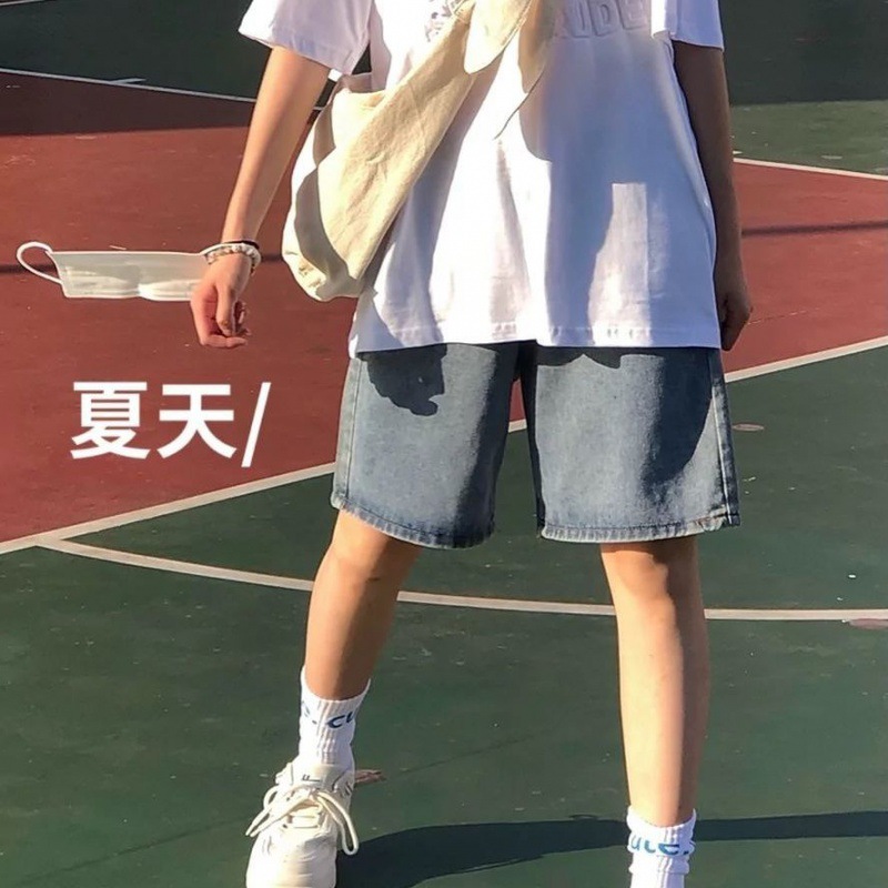 五分牛仔短裤女夏2022新款学生宽松高腰直筒韩版阔腿中裤子潮百搭