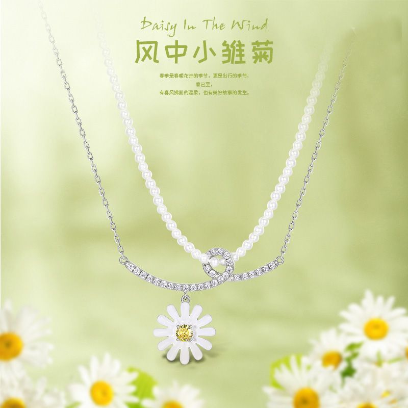春季新款清新甜美小雏菊S925纯银项链原创设计双层珍珠项链批发