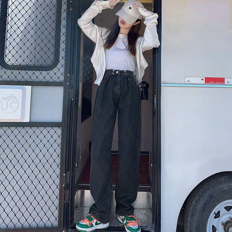 黑色牛仔裤韩版女黑灰色春秋季学生高腰显瘦直筒拖地阔腿裤潮