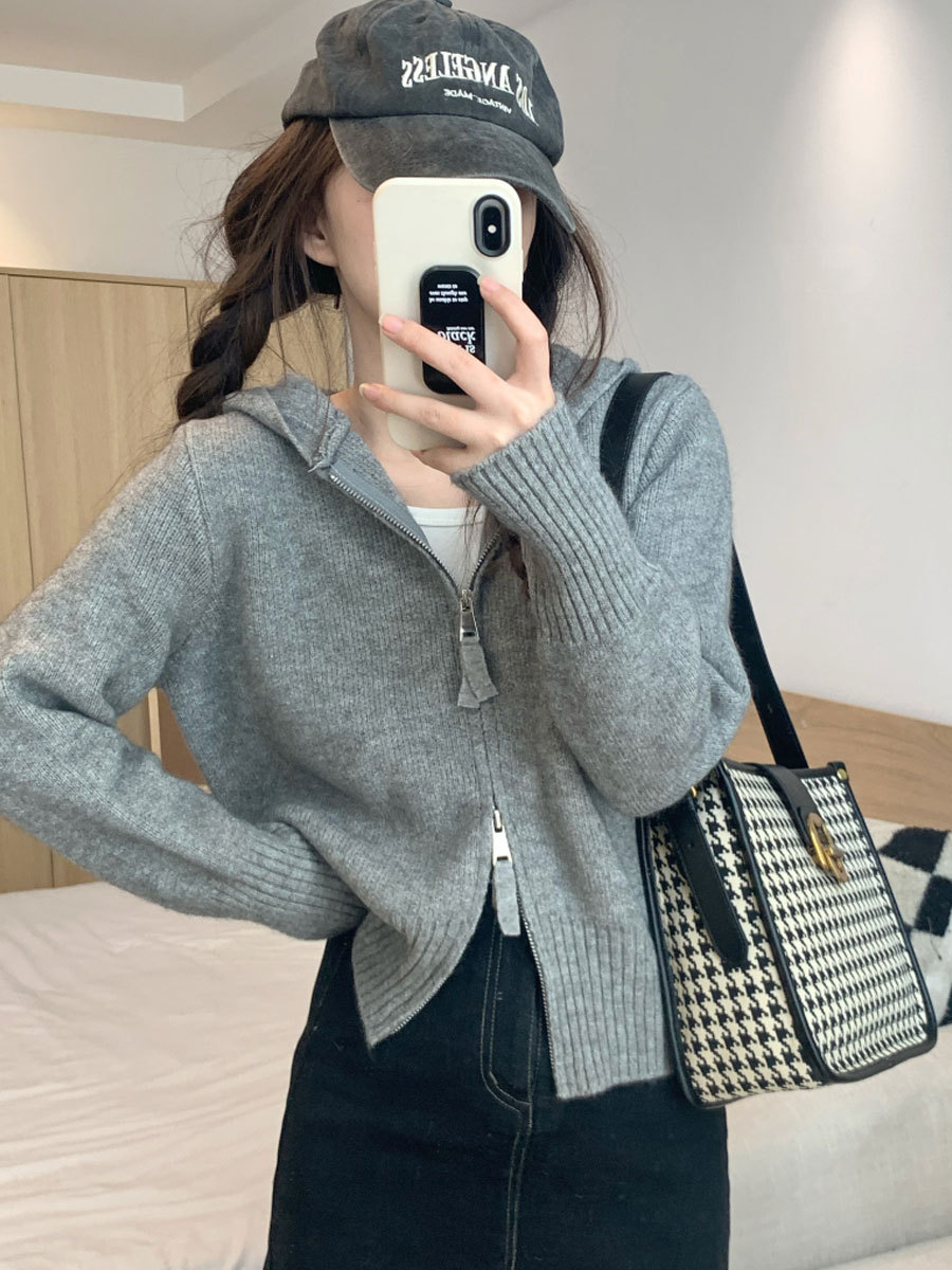 灰色双拉链短款针织帽打底开衫女秋冬内搭连毛衣独特上衣小众外套
