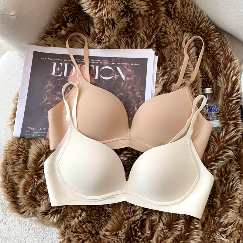 素面小V 一片式无痕内衣女自发热保暖无钢圈小胸聚拢文胸侧收副乳