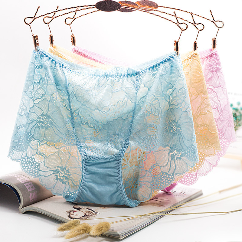 4条装 性感内裤女中腰蕾丝透明诱惑收腹提臀无痕大码女士三角裤夏