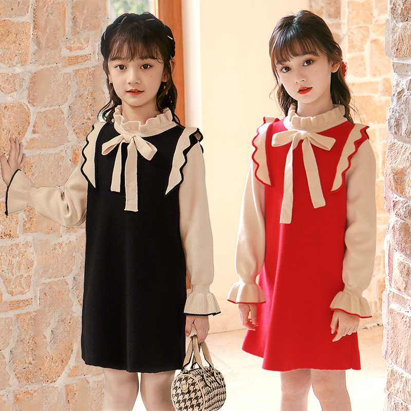女童毛衣2022新款秋冬洋气针织连衣裙中大童长袖蝴蝶结中长款裙子