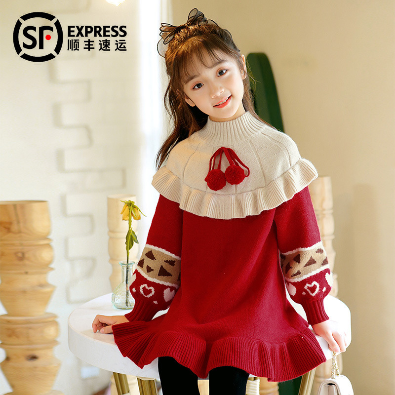 女童毛衣裙童装中长款女大童秋冬针织连衣裙儿童女童红色圣诞毛衣