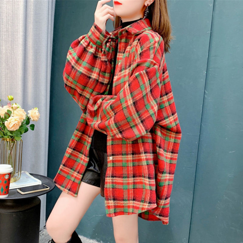 格子衬衫女棉加厚磨毛春秋新款宽松复古百搭长袖衬衣外套上衣