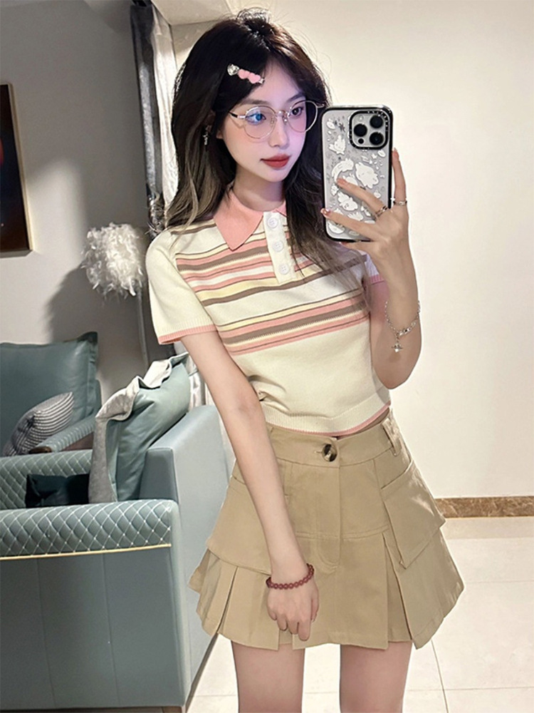 2023美式复古粉色条纹polo短款上衣女夏季新款辣妹正肩短袖t恤女