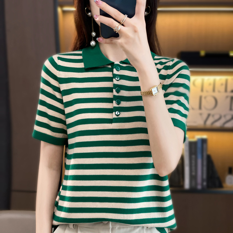 精纺纯棉POLO领针织衫短袖女夏款条纹外穿t恤时尚百搭三分袖上衣