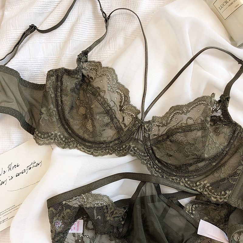 法式超薄性感聚拢蕾丝边透视大胸显小有钢圈透明胸罩内衣文胸套装