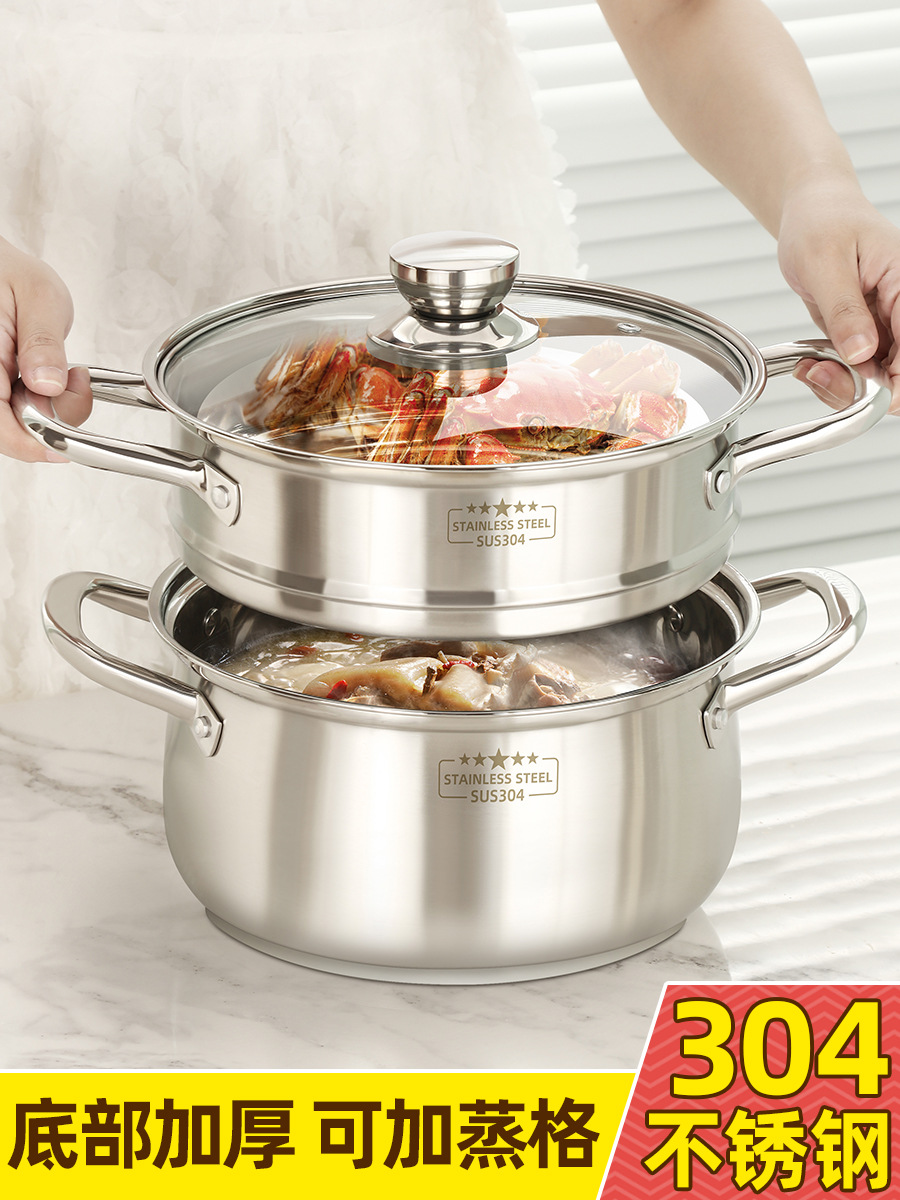 不锈钢汤锅304食品级加厚电磁炉带蒸笼蒸煮锅煮锅家用燃气双耳锅