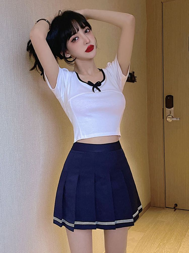 jk学院风套装夏季新款短袖白色短上衣高腰短裙半裙减龄洋气两件套