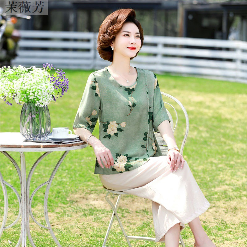 新款妈妈夏装民族风套装潮妈女装高级薄款夏季老年人女装遮肉显瘦