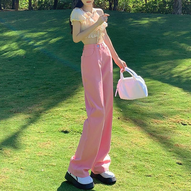 粉色牛仔裤高腰阔腿女潮直筒宽松显瘦休闲垂坠感拖地裤长裤子代货