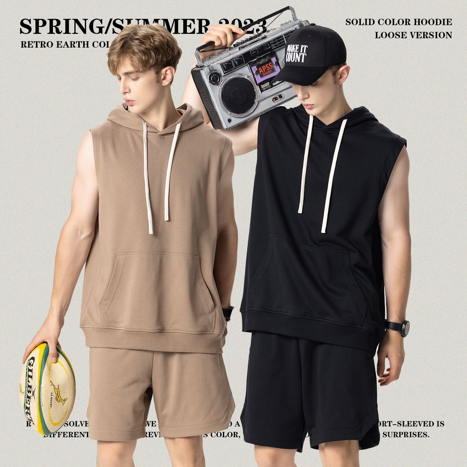 RS男装|2023夏季男女纯色连帽无袖T恤个性潮流坎肩休闲套装背心男