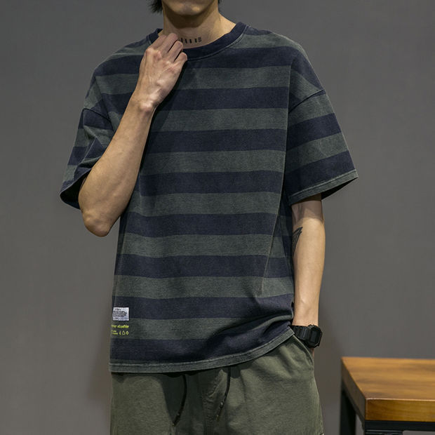 2023新款男士短袖t恤圆领夏季体恤韩版潮流条纹潮牌宽松半袖