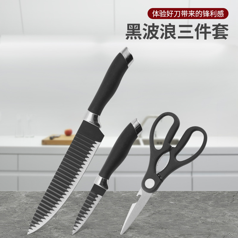 工厂现货批发新款不锈钢黑波浪三件套厨师刀水果刀厨用剪刀具套装