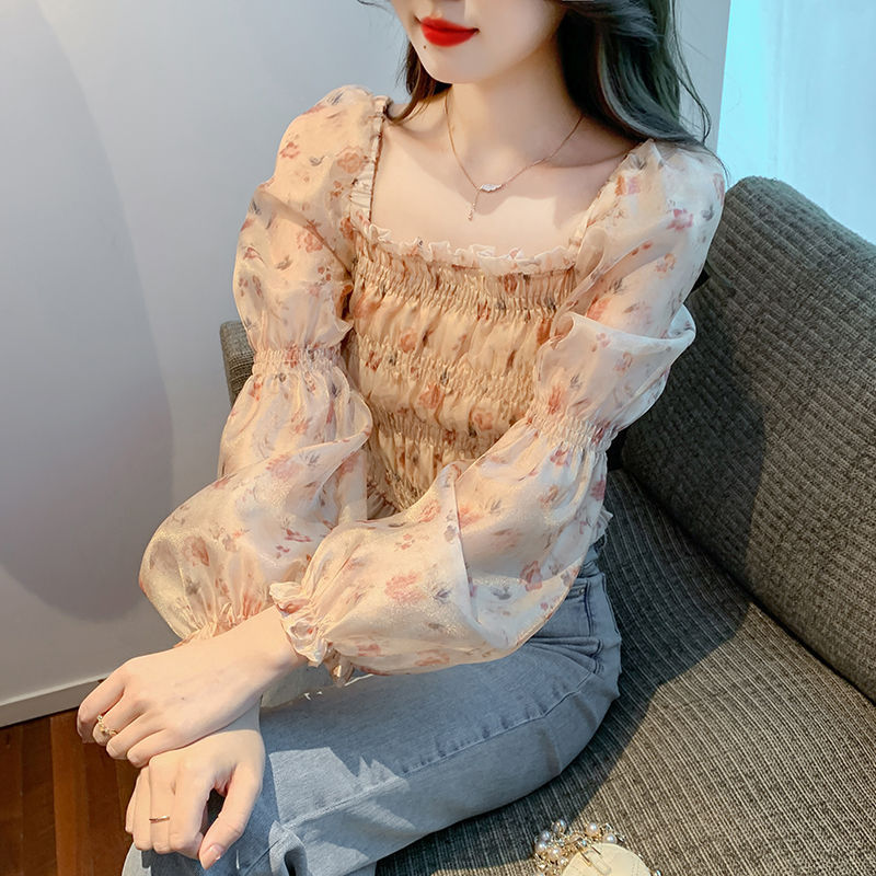 方领碎花长袖雪纺衬衫女春装新款法式锁骨设计感小众别致短款上衣