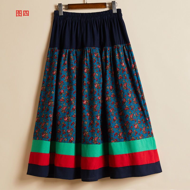 四季裙棉麻半身裙印花拼接裙有口袋包包大摆裙中长款民族风女长裙