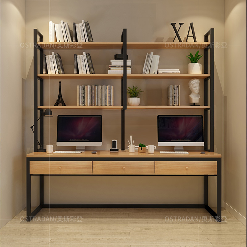 实木双人书桌书架组合书柜一体桌写字台家用学习桌长条电脑桌