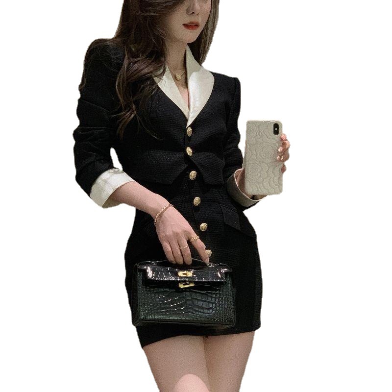 早秋韩版气质御姐风撞色领短款西装外套上衣+高腰包臀半身裙套装