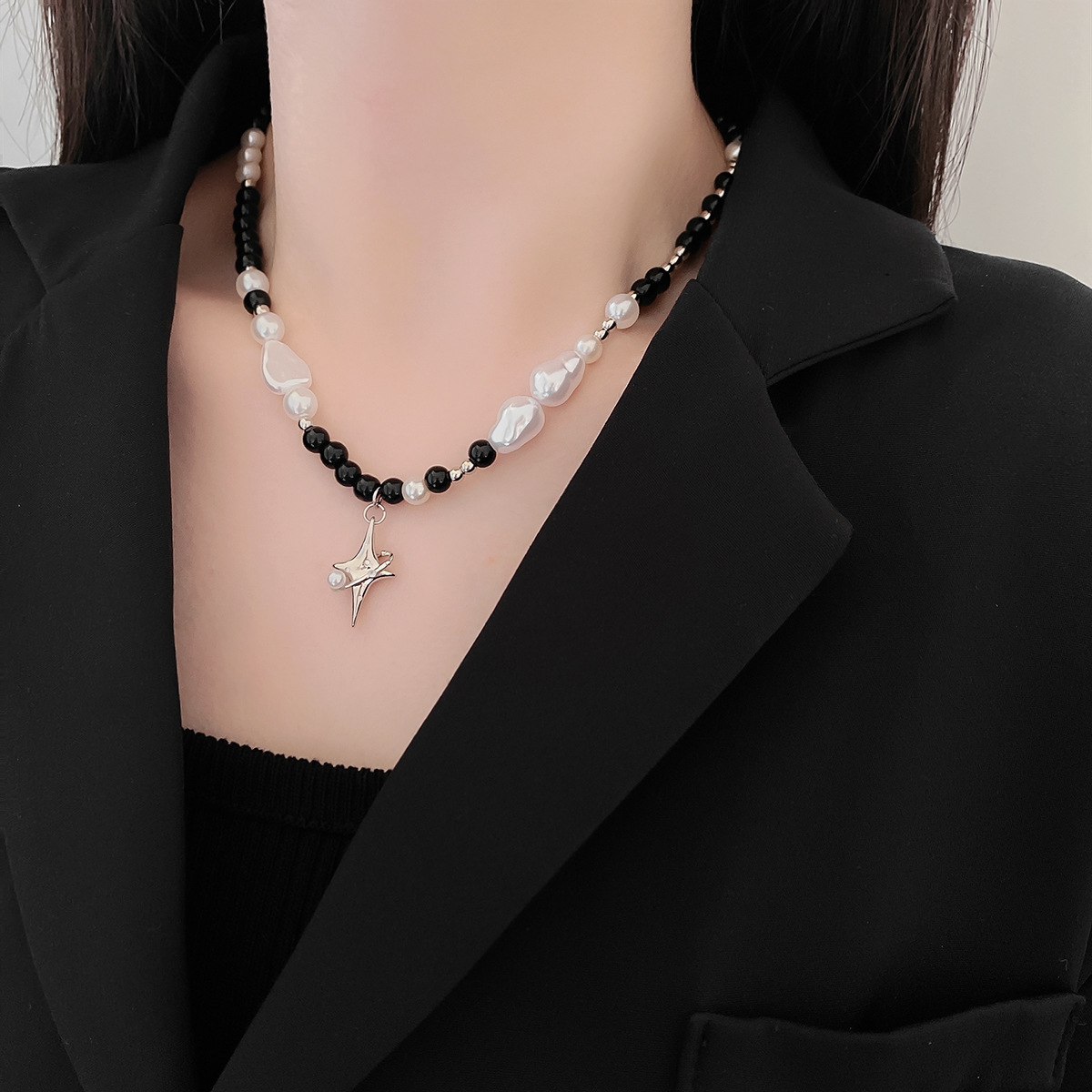 黑白撞色珍珠拼接项链女小众设计潮酷手工串珠嘻哈星芒中性锁骨链