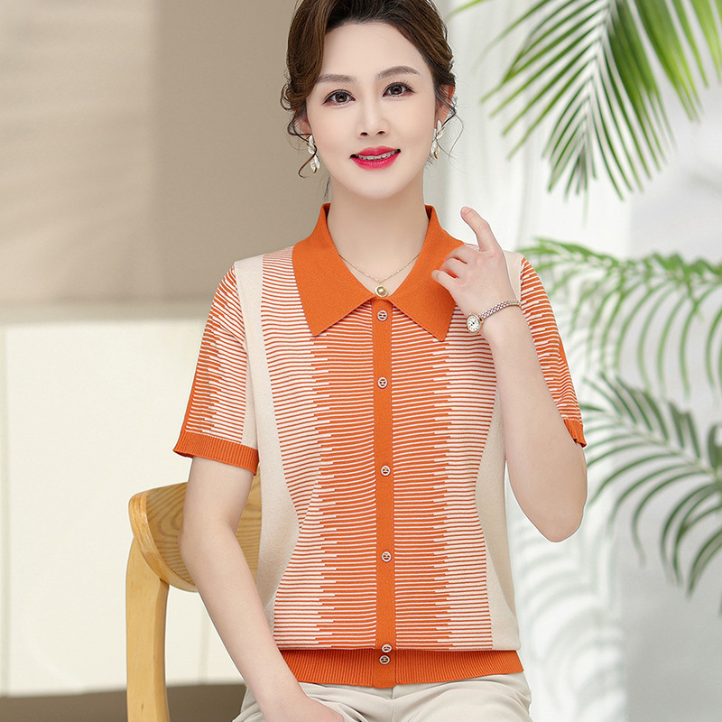 妈妈夏装冰丝上衣洋气翻领短袖针织小衫时尚减龄宽松条纹薄款t恤