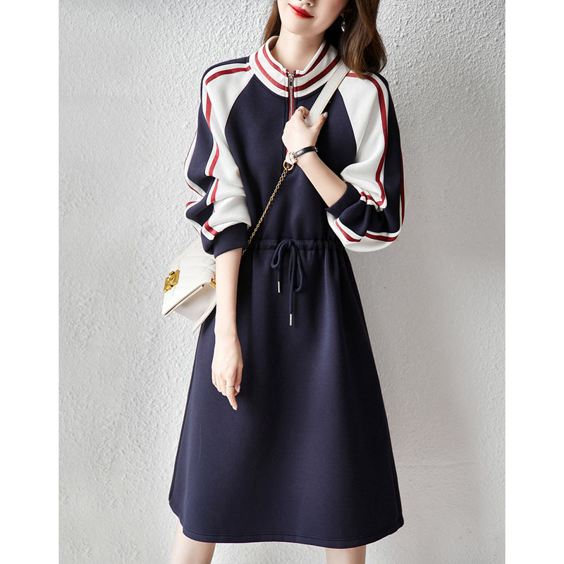 春秋连衣裙女撞色简约气质中长款裙收腰休闲法式卫衣裙女款现货