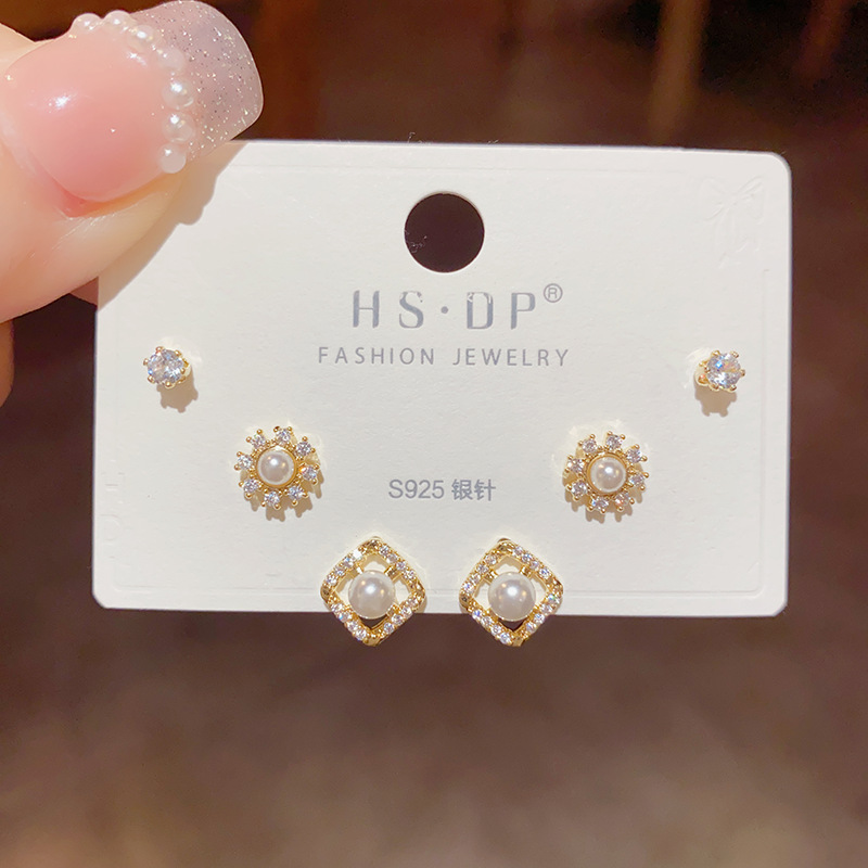 韩式时尚气质精致小巧几何珍珠花朵耳钉组合套装简约百搭耳环批发