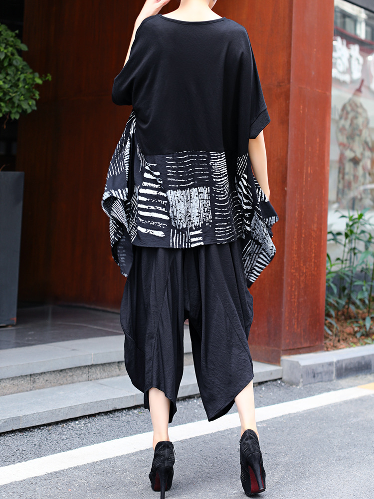 夏季条纹二件套宽松加肥加大胖套装女哈伦裤七分阔腿灯笼裤