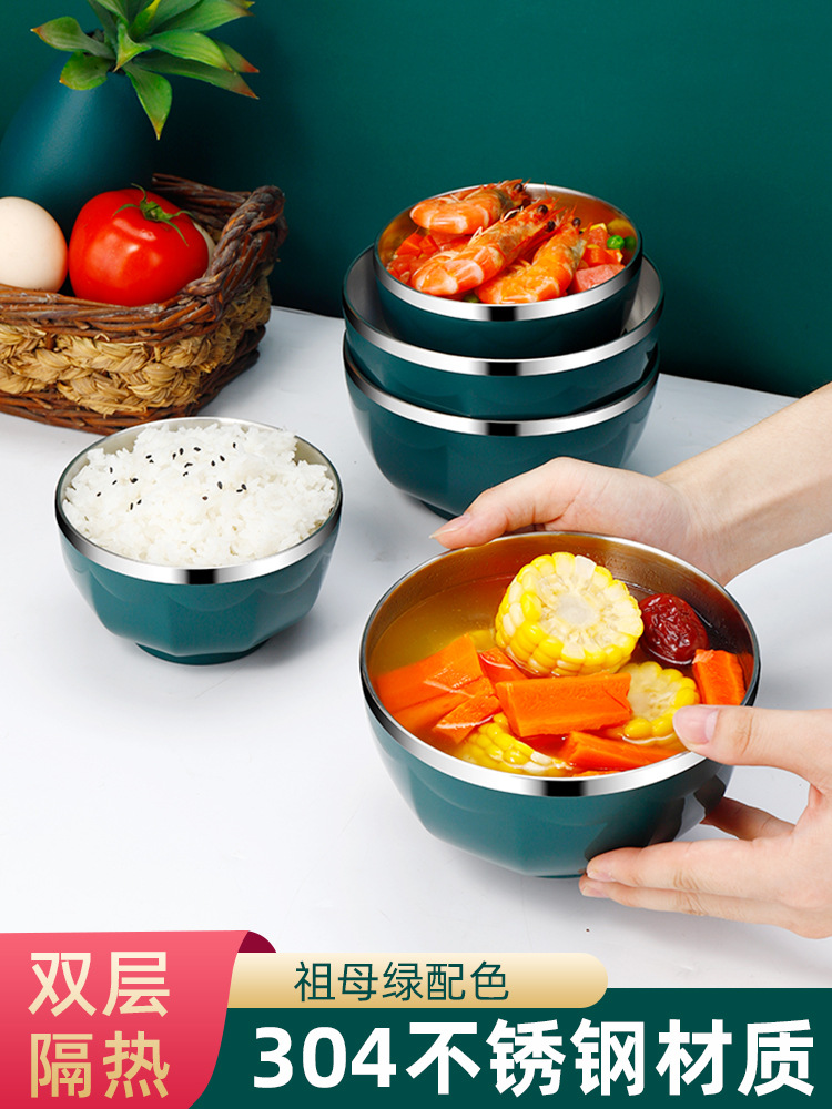 新款304不锈钢碗家用儿童吃饭碗学生汤碗双层防烫防摔碗具