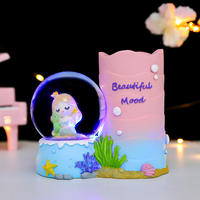 海底珊瑚美人鱼公主卡通水晶球笔筒收纳桌面装饰品学生收纳盒摆件