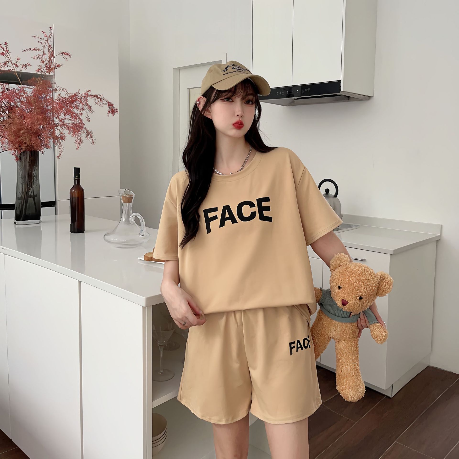 新款夏季卫衣休闲运动套装女 印花圆领落肩短袖T恤阔腿短裤两件套