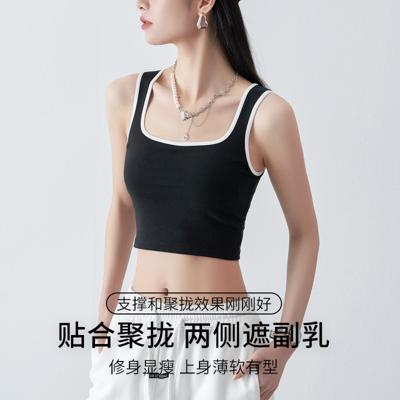 吊带小背心女夏季带胸垫文胸一体方领撞色内搭设计感短款外穿上衣