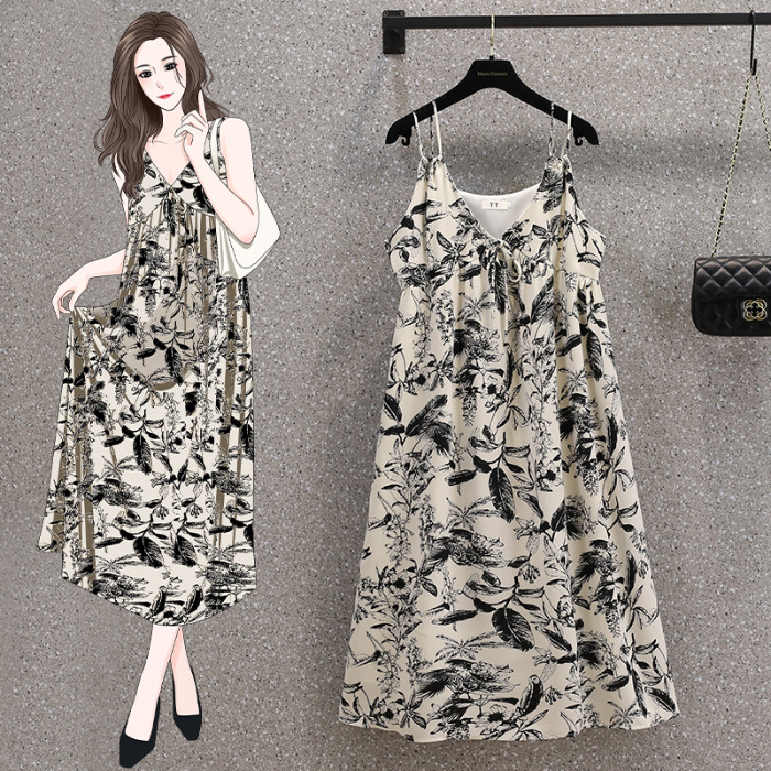 新款夏季水墨色吊带性感连衣裙碎花沙滩风连衣裙高级气质连衣裙