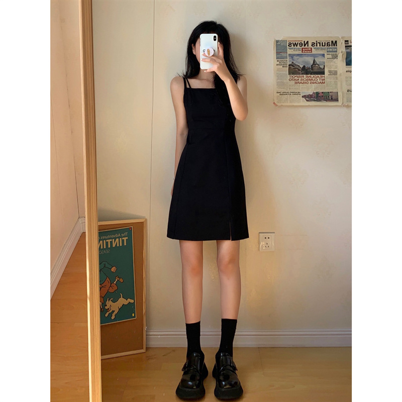 性感吊带连衣裙高腰显瘦侧开叉纯黑色辣妹风气质短裙收腰肩带可调