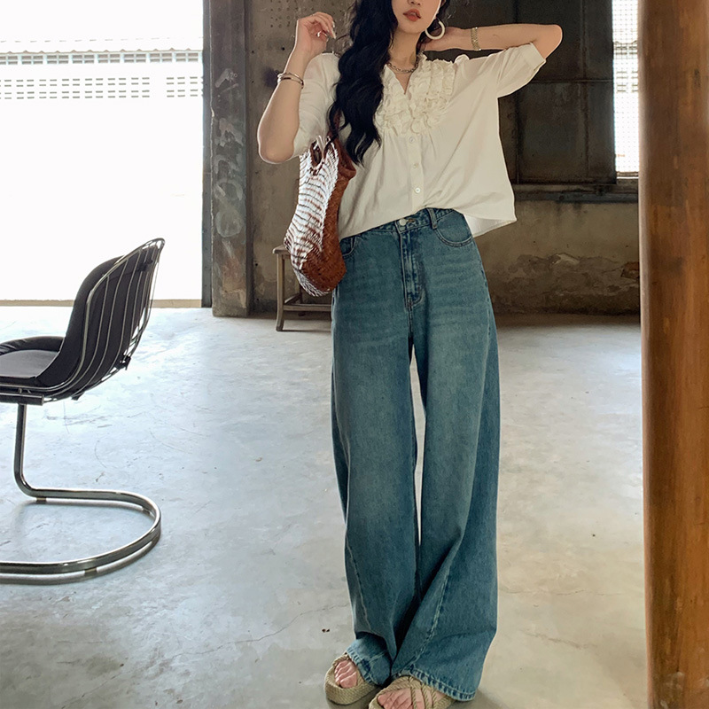 小任艺复古蓝色牛仔裤女春夏2023年新款宽松直筒阔腿泫雅风裤垂感