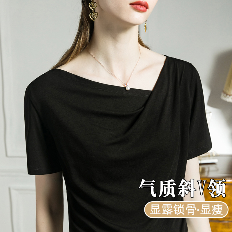 黑色中袖T恤女夏季新款不规则设计感斜v领法式纯色1688上衣女批发